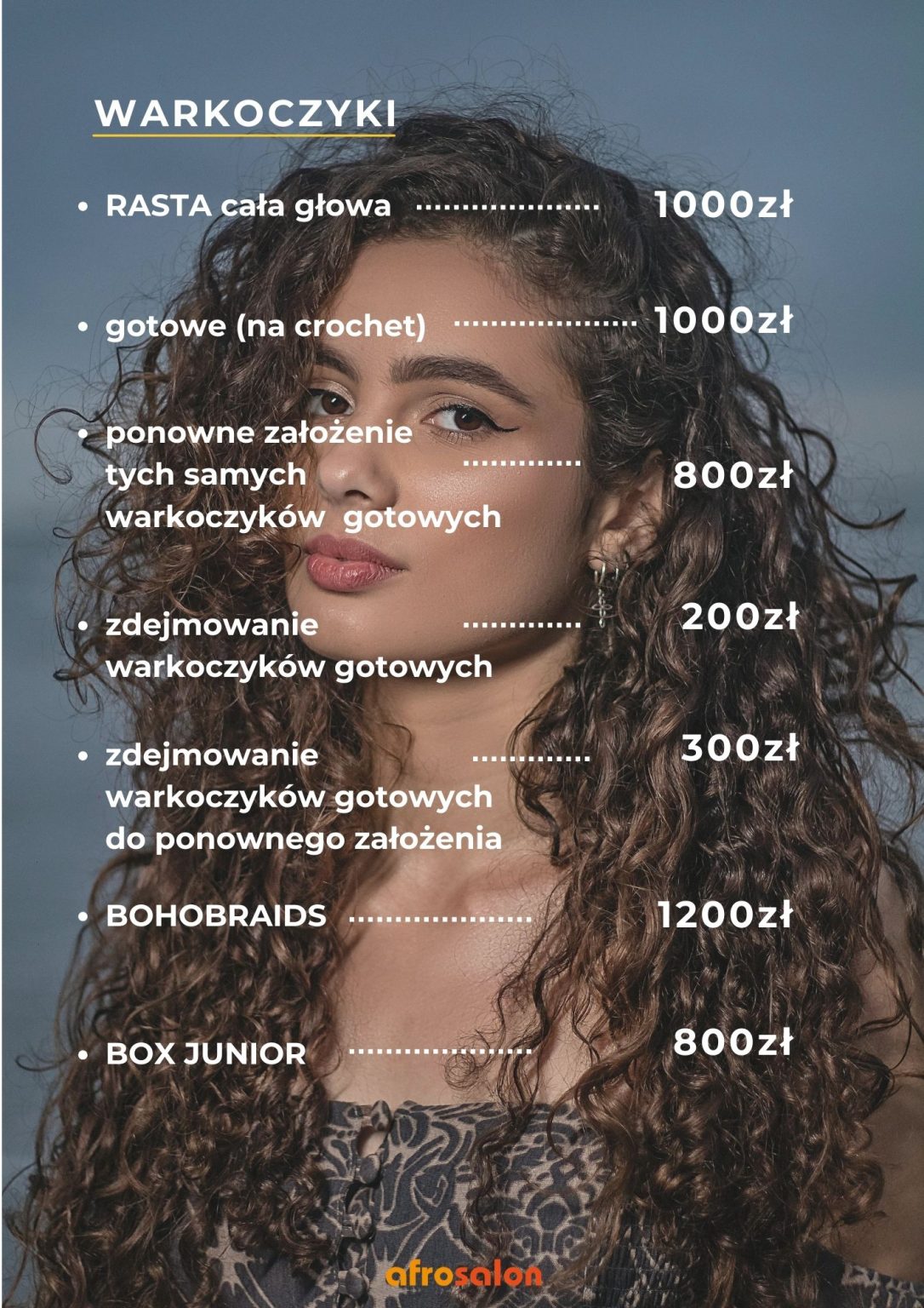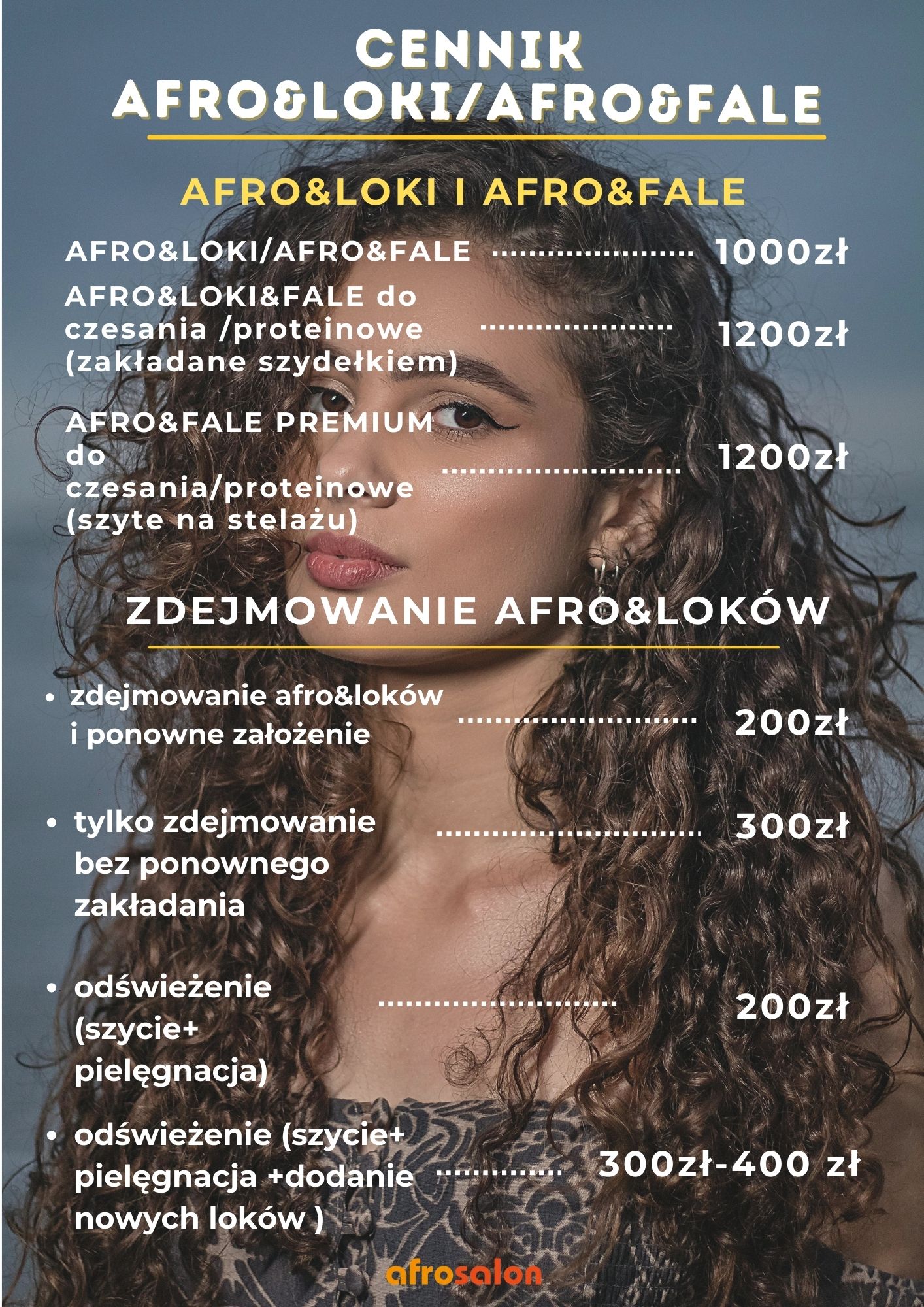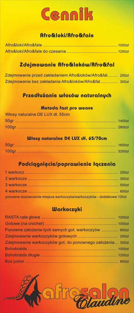 Afrosalon Claudine to niesztampowe miejsce, zrodzone z miłości do jedynej w swoim rodzaju – afrykańskiej kultury. Uważamy, że włosy są narzędziem, dzięki któremu możemy wyrażać Siebie i dowolnie wpływać na to, jak odbierają nas inni. Nieprzerwanie od dwudziestu lat uszczęśliwiamy kolejne osoby, odmieniając ich wizerunek nutą egzotyki. Jeżeli pragniesz poczuć się wyjątkowo i zaskoczyć innych oryginalną fryzurą, Afro Salon to miejsce idealne dla Ciebie! Nasze stylistki doskonale wiedzą jak dobrać uczesanie, aby podkreślić Twoje atuty oraz wyeksponować wewnętrzną charyzmę.