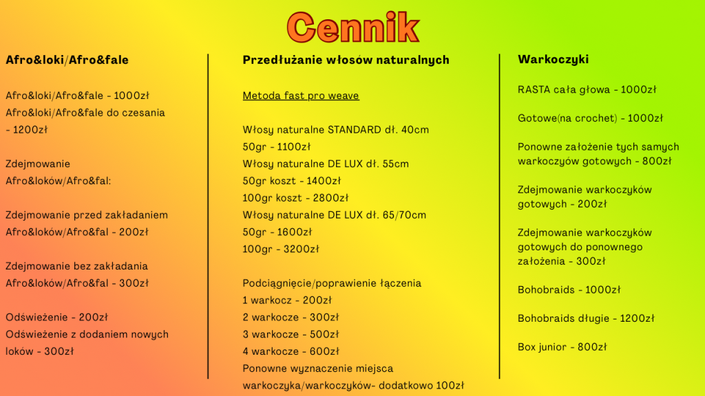 Afrosalon Claudine to przede wszystkim ludzie. Grupa rodowitych Afrykanek pochodząca z różnych krajów Czarnego Lądu, które sprawiają, że egzotyka tego miejsca jest autentyczna, żywa i namacalna. Dzięki temu nie musisz udawać się w odległe podróże, aby poczuć tropikalny klimat Afryki. Masz go dosłownie na wyciągnięcie ręki! Nasze stylistki doskonale wiedzą jak dobierać fryzury, aby były nie tylko piękną ozdobą naszych Klientek, ale także elementem wydobywającym ich pewność siebie. Wygoda, oryginalność i charakter to elementy, którymi kierujemy się, wykonując dla Was metamorfozy. Jeśli Twoim marzeniem jest dodanie objętości i ‘’pazura’’ swoim włosom bądź wyjeżdżasz na wakacje i zależy Ci na wygodnej, ale również efektownej fryzurze – zespół Afrosalon już na Ciebie czeka. Sprawdź naszą ofertę i zainspiruj się do zmian!